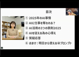 - テーマ/講師:「AIは補助者になれるか」日本生成AI推進協会 副理事長 Youtuber かわごん 様